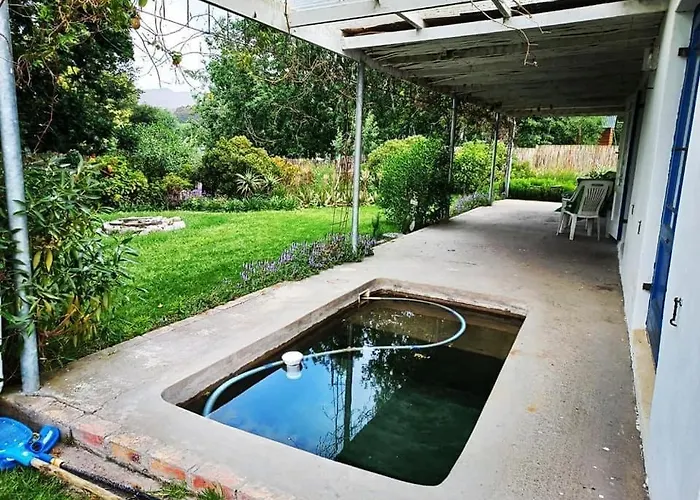 Située au Cap, Villa Seven Mystical Oaks propose une piscine privée ainsi que cette terrasse et ce jardin. Ca prend 15 minutes de route pour se rendre dès la propriété à Klein River Cheese Factory.